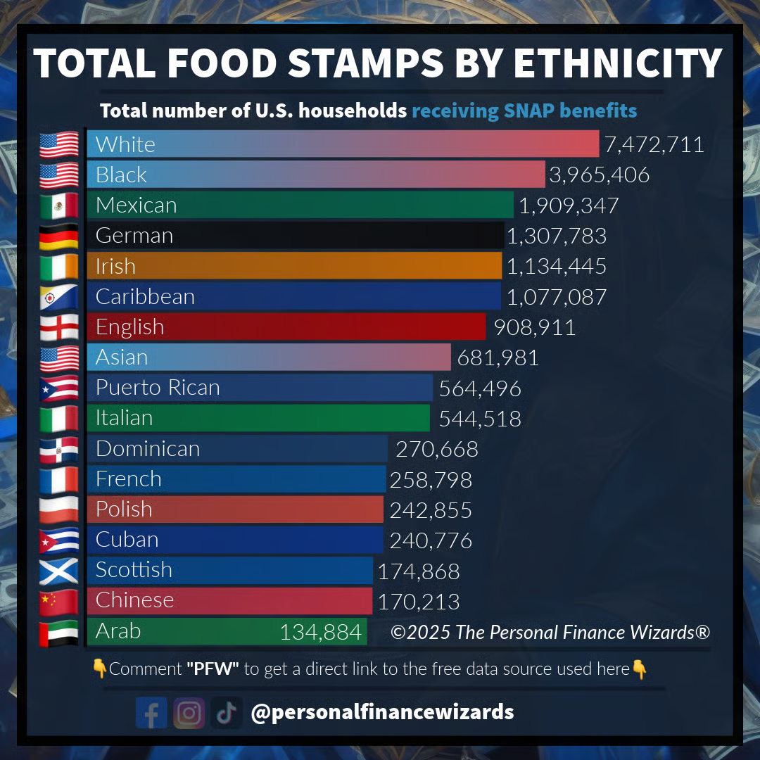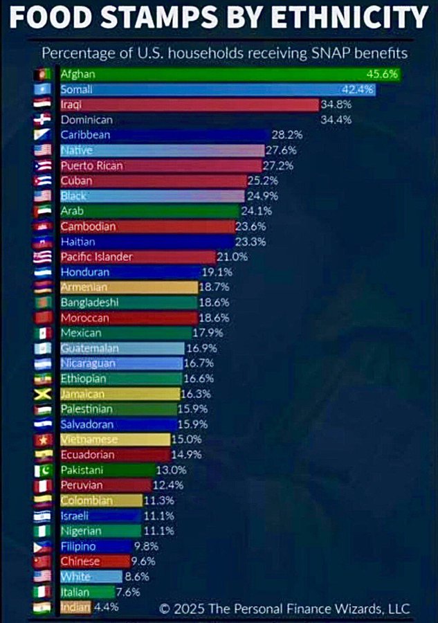 The graphic, as seen above, is a horizontal bar chart that lists different “ethnicities” that receive SNAP benefits. The first problem is how they define “ethnicity”. There is a blending, deliberate, in my opinion of ethnicity, race, and national origin. For example, the first listing in the graphic, Afghani, is misleading because it does not make clear if they are discussing ethnic Pashtuns who comprise about 42% of Afghanis and who may also be called Afghani in country of if it comprises other ethnic groups prevalent in Afghanistan such as Tajiks, Hazaras, Uzbeks, or other ethnic or tribal groups who reside in Afghanistan. Further, this graphic does not distinguish between immigrants from Afghanistan who have been in the US, legally, for more than five years and meet the other eligibility requirements and US Citizens who are ethnically connected to Afghanistan.